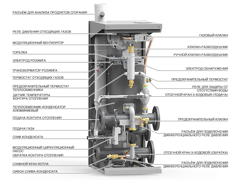 - Внутри модуля для каждого котлоагрегата предусмотрен собственный циркуляционный насос. Все котлоагрегаты модуля подключены к общим коллекторам подачи топлива, подаче и обратки контура отопления, отвода конденсата.
