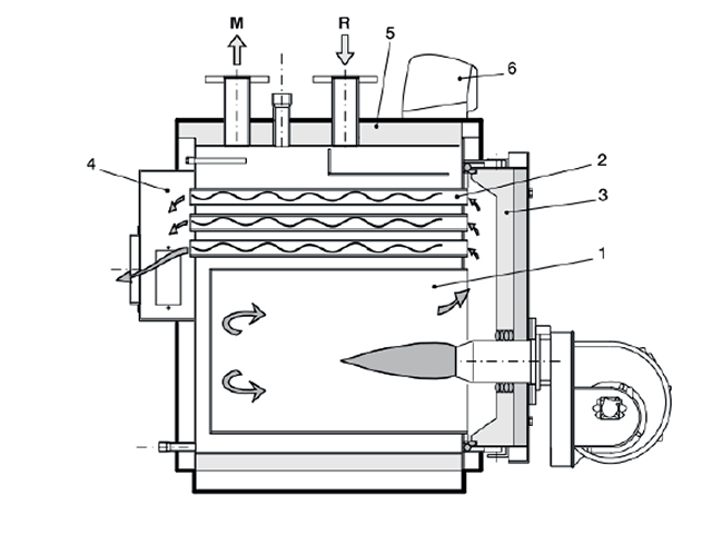 Водогрейный котел с инверсионной камерой сгорания. Котел может быть укомплектован вентиляторной горелкой на жидком и газообразном топливе.